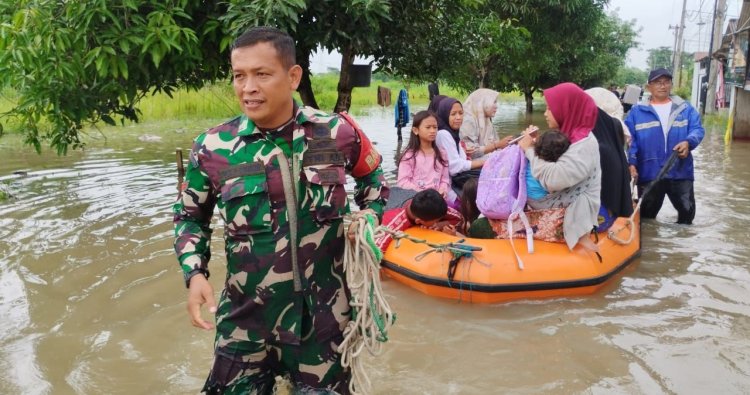 Di tengah genangan air yang cukup tinggi, personel TNI ini turun langsung memastikan keselamatan kelompok rentan seperti lansia dan anak-anak agar dapat dipindahkan ke titik pengungsian yang lebih aman.