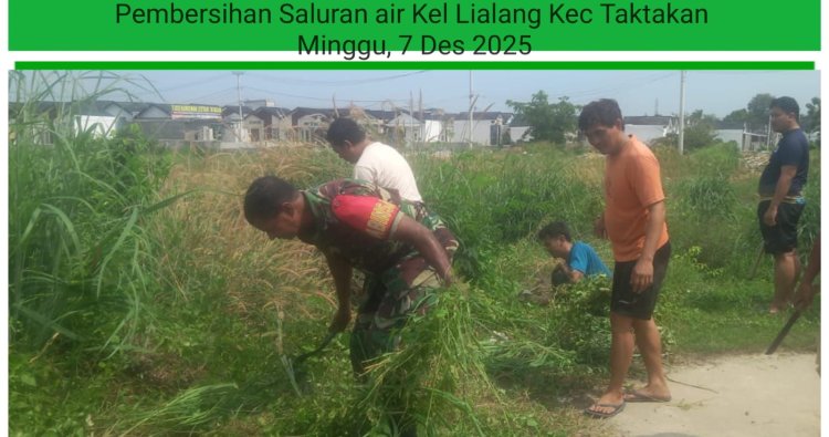 Banten, - Babinsa Koramil 0602-04/Taktakan Kodim 0602/Serang Sertu Gaspar Morais, melaksanakan kegiatan Karya Bakti (Karbak) pembersihan saluran air bersama warga secara bergotong royong, bertempat di Kelurahan Lialang Kecamatan Taktakan, Kota Serang, Provinsi Banten, Minggu (07/12/2025).