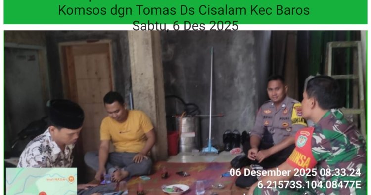 Banten, - Babinsa Koramil 0602-15/Baros Kodim 0602/Serang Sertu Utep Juheri, melaksanakan kegiatan Komunikasi Sosial (Komsos) bersama Tokoh Masyarakat membahas tentang Keamanan dan Ketertiban Masyarakat (Kamtibmas), bertempat di Desa Cisalam Kecamatan Baros, Kabupaten Serang, Provinsi Banten, Sabtu (06/12/2025).