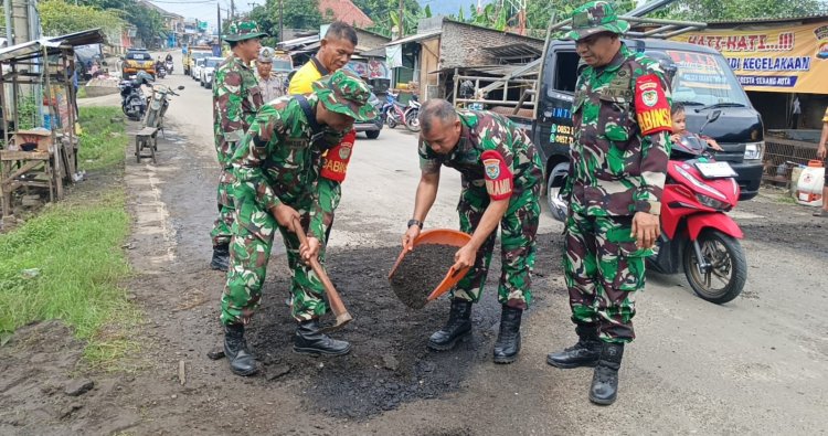 Bersama Kapolsek Kramatwatu, Kompol Bai Ma'mun, personel TNI-Polri bahu-membahu melaksanakan aksi penambalan jalan berlubang, bertempat di wilayah jalan utama Desa Kramatwatu, Kecamatan Kramatwatu, Kabupaten Serang, Provinsi Banten, Jumat (13/02/2026).