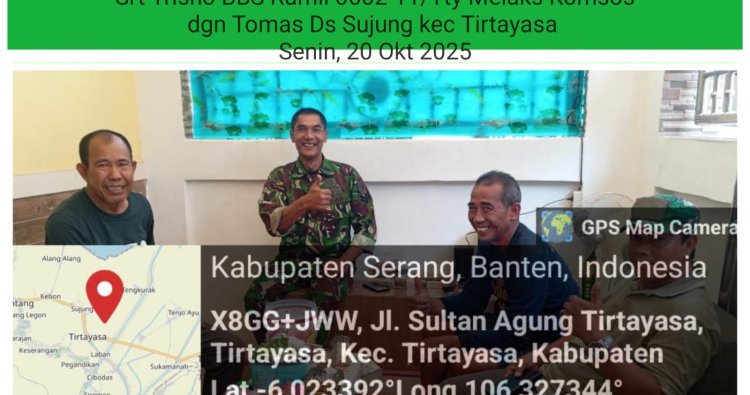 Bintara Pembina Desa (Babinsa) Koramil 0602-11/Tirtayasa Kodim 0602/Serang, Sertu Trisno, melaksanakan kegiatan Komunikasi Sosial (Komsos) yang berfokus pada silaturahmi dengan tokoh masyarakat, bertempat di Desa Sujung, Kecamatan Tirtayasa, Kabupaten Serang, Provinsi Banten, Senin (20/10/2025).