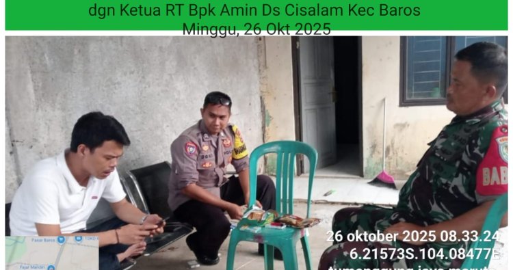 Banten, - Babinsa Koramil 0602-15/Baros Kodim 0602/Serang Sertu Utep Juheri, melaksanakan kegiatan Komunikasi Sosial (Komsos) bersama Ketua RT dalam rangka silaturahmi, dan membahas tentang Keamanan dan Ketertiban Masyarakat (Kamtibmas), bertempat di Desa Cisalam Kecamatan Baros Kabupaten Serang, Provinsi Banten, Minggu (26/10/2025).